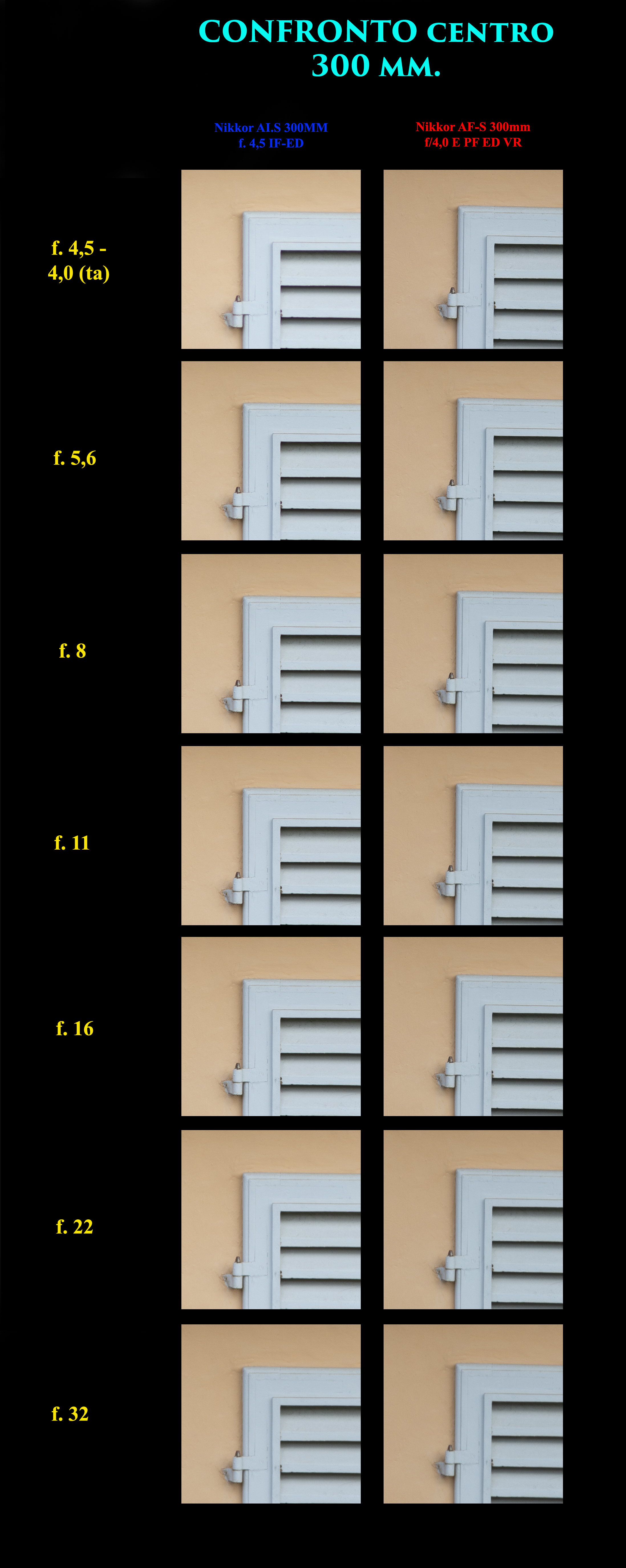 Una cosa però che salta subito all’occhio nel confronto agli angoli delle foto è la sensibile maggior caduta di luce del nuovo 300mm rispetto al vecchio ai.s soprattutto a tutta apertura!!