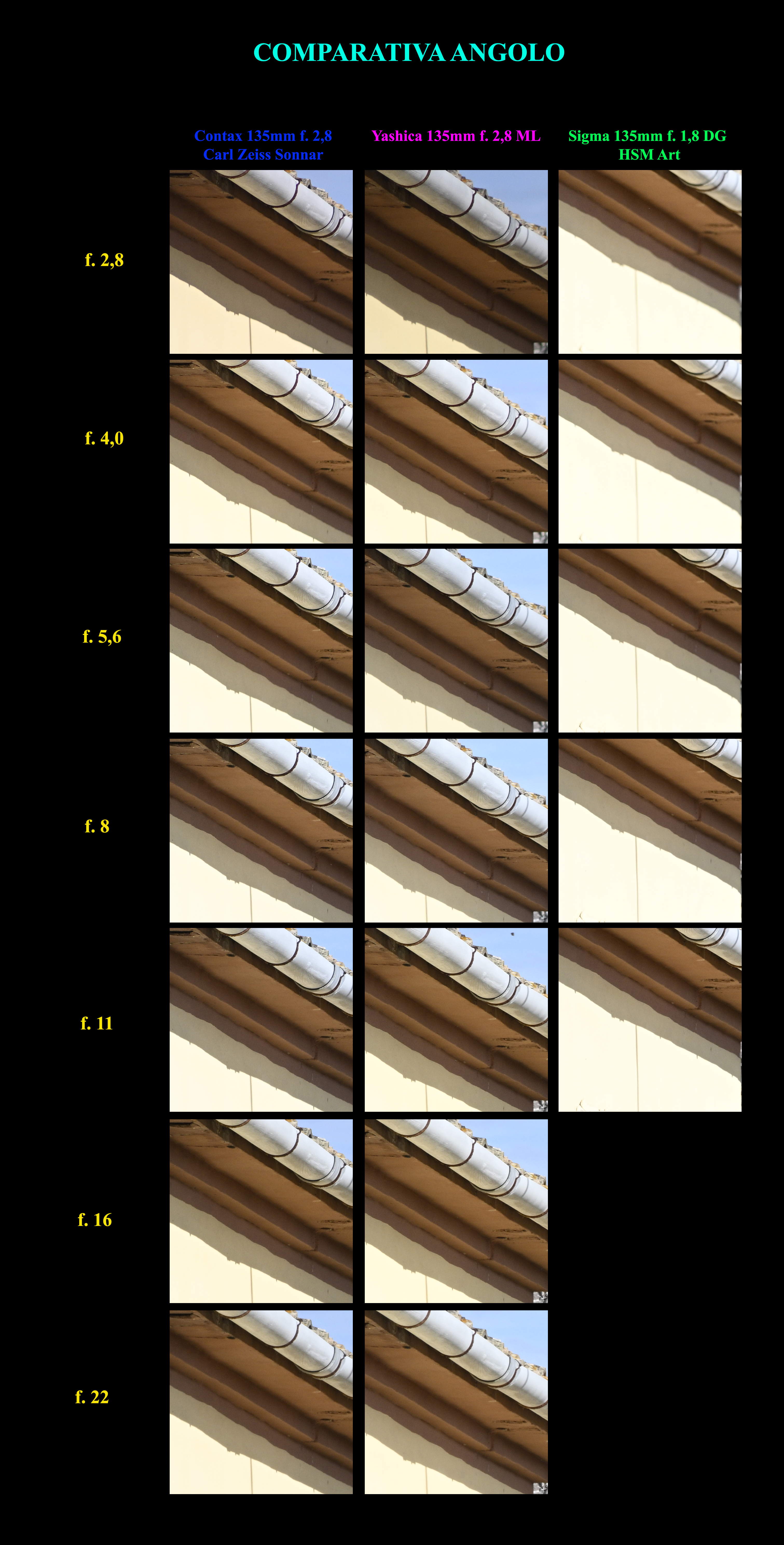 Agli angoli il Contax e lo Yashica si equivalgono, mentre il Sigma, fino a f. 4,0 è decisamente il peggiore, a f. 5,6 ed ad aperture minori i tre obiettivi non restituiscono foto con differenze sostanziali.