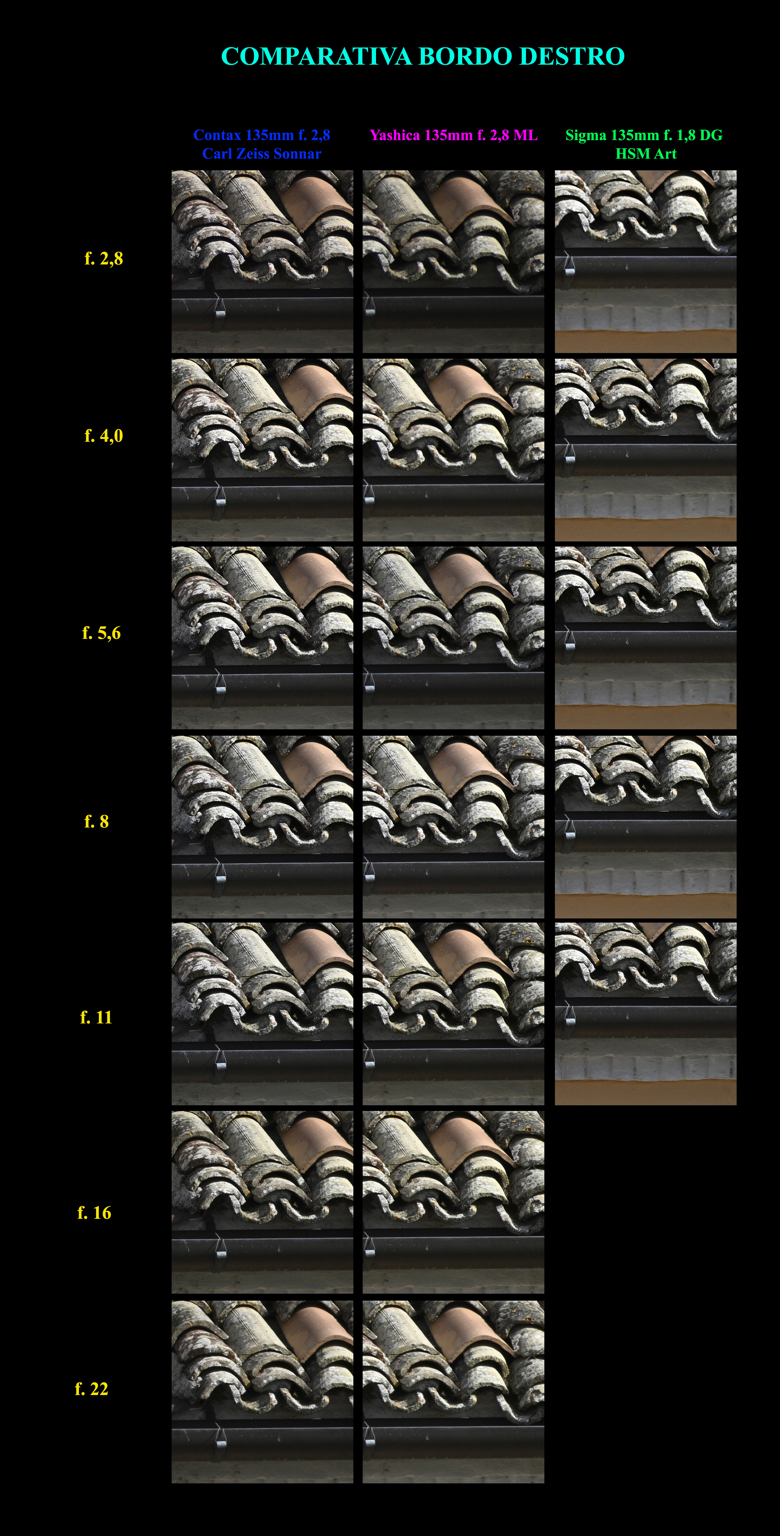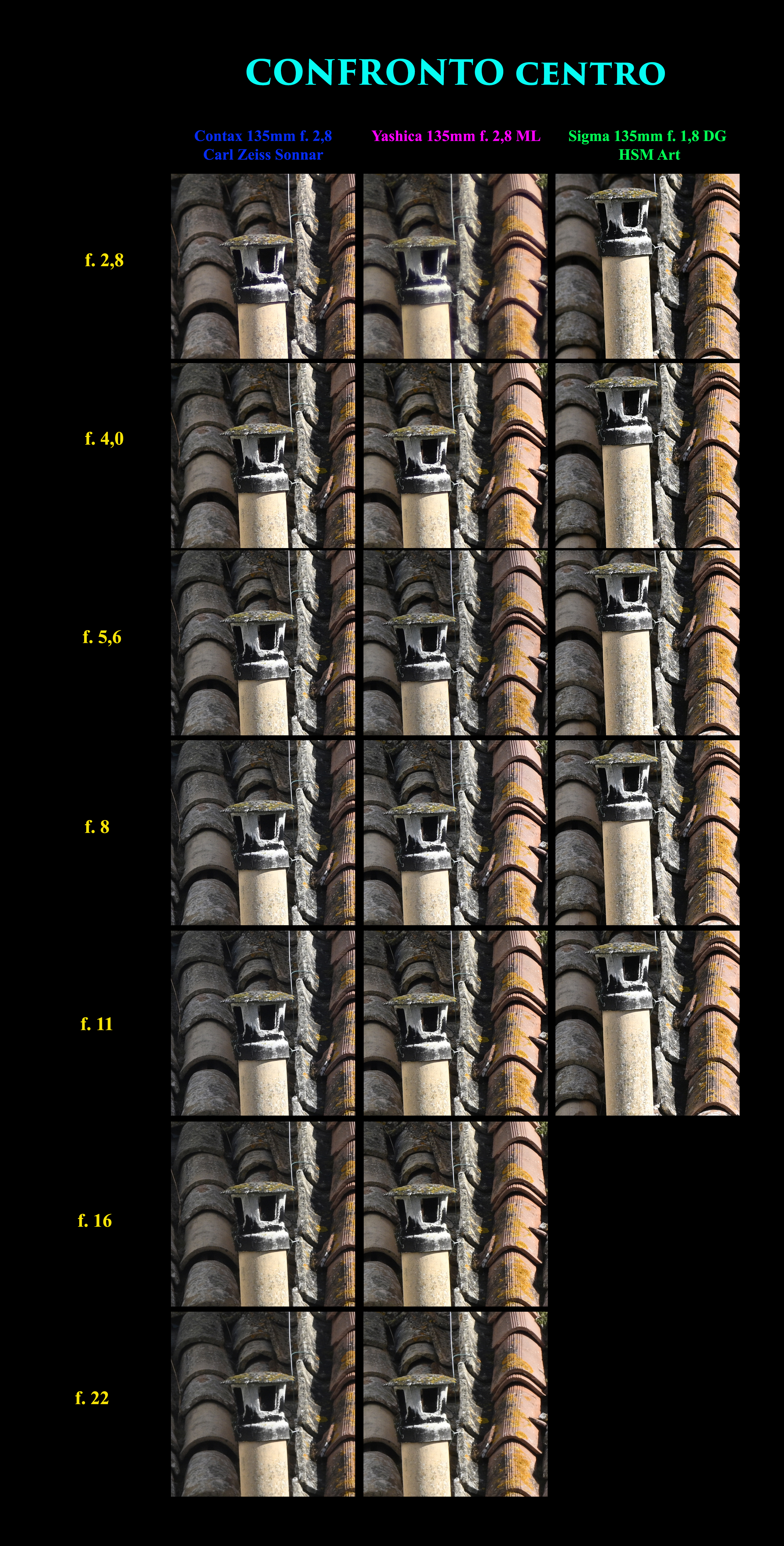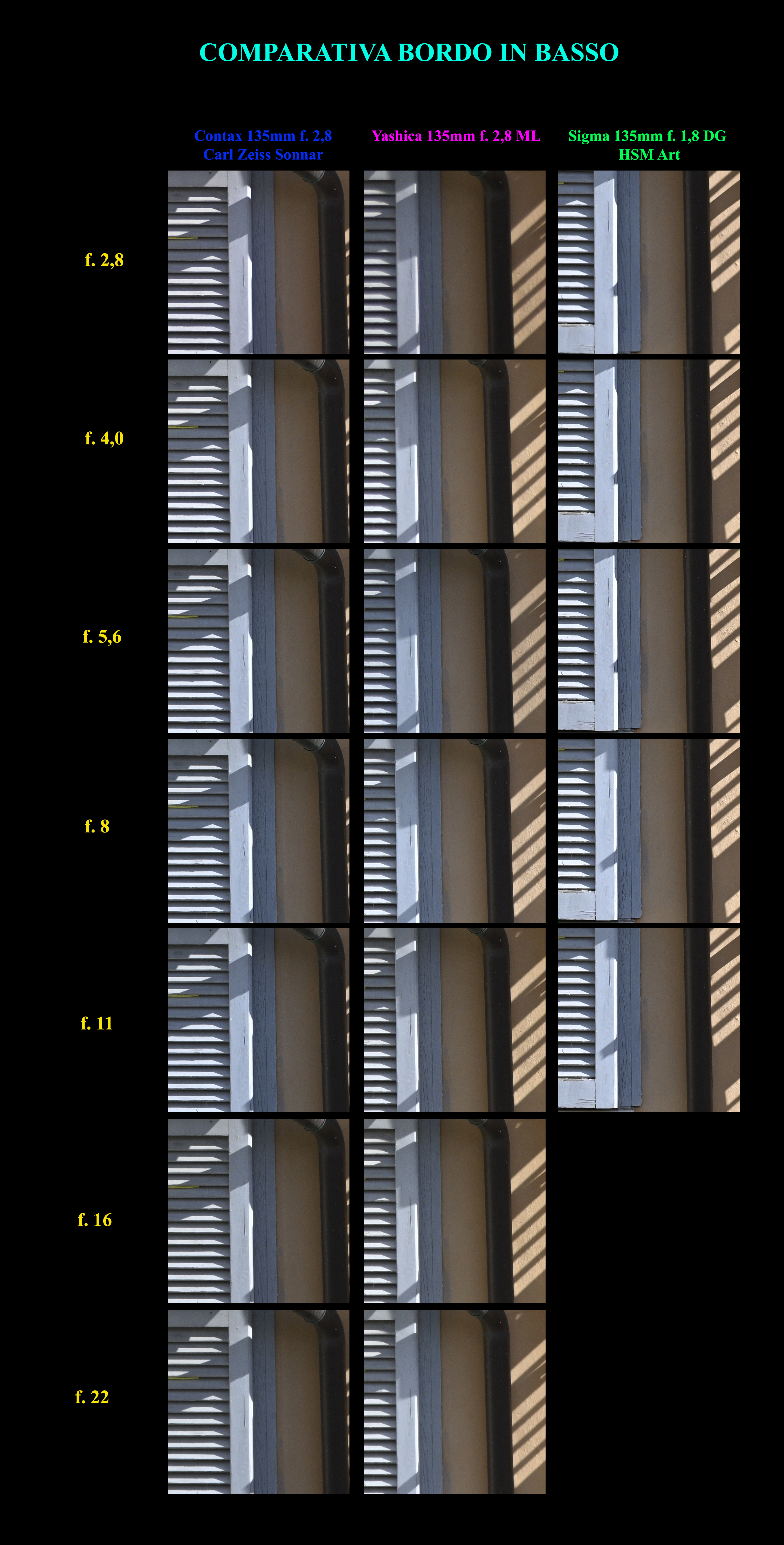 Al centro dei fotogrammi, a tutta apertura (f. 2,8), il Contax è decisamente migliore dello Yashica, ma il Sigma è il migliore di tutti (ma essendo un f. 1,8 lo scatto è già diaframmato di più di uno stop e quindi direi che è abbastanza normale), ma già a f. 4,0 la situazione si livella decisamente e tutti e tre gli obiettivi restituiscono degli ottimi scatti. Solo ai diaframmi più chiusi (f. 16/22) il Contax cede un po’ il passo allo Yashica.